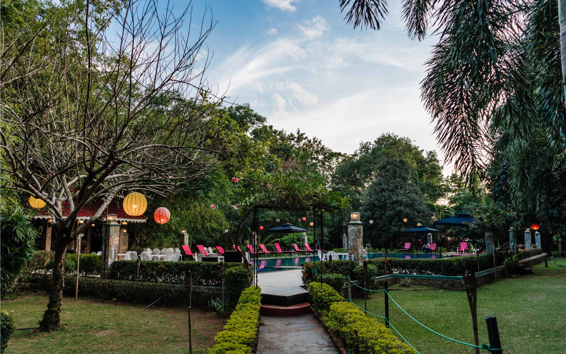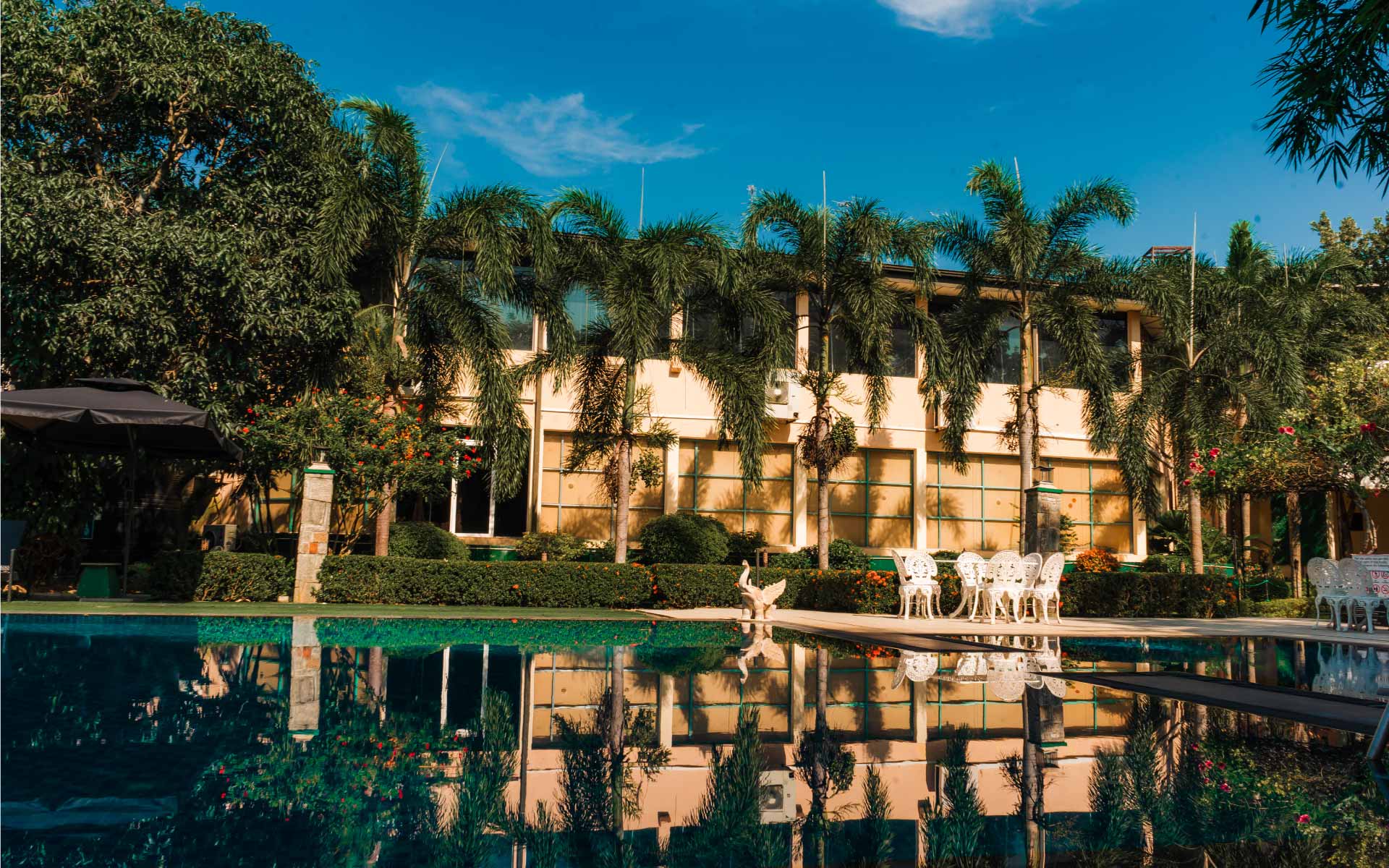 Experience the refreshing ambiance at our pool bar, where you can enjoy a drink outdoors while basking in the cool surroundings. The lush greenery and expansive pool create a delightful setting for an enhanced experience.